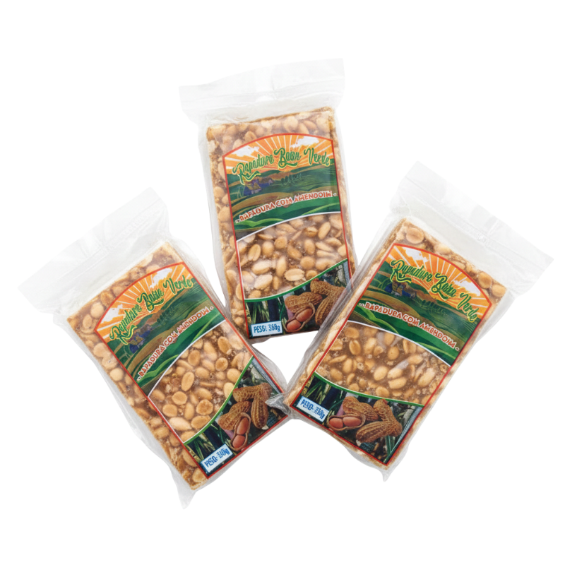 Rapadura combinada com amendoim, resultando em sabor doce e levemente tostado, textura firme e agradável ao paladar. Embalagem de 400 g.